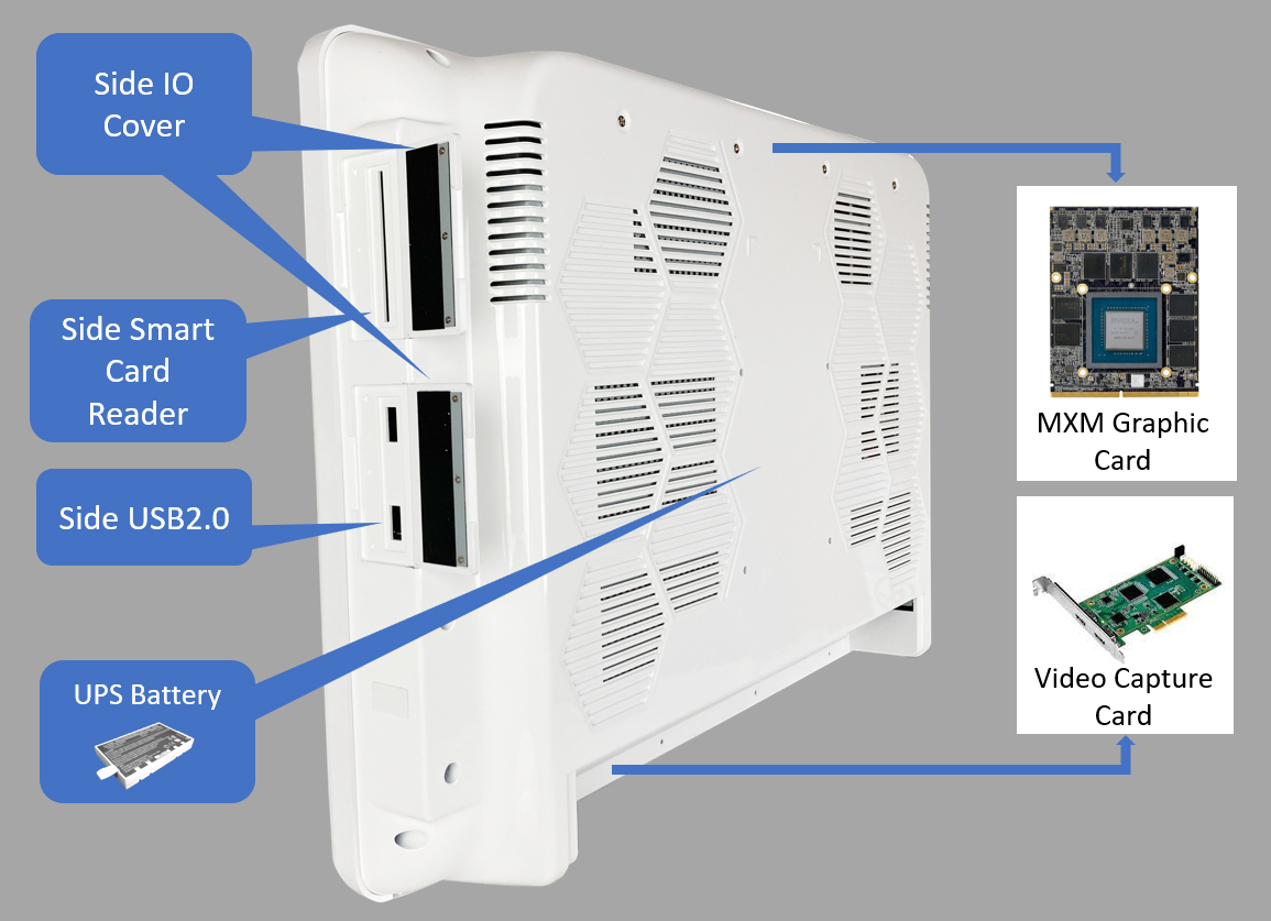 Fig 2. WMP-19S/22S/24S Series Featured at Embedded MXM Graphic Card, PCIe Expansion Card for Video Capture Card, Side Smart Card Reader Slot, Up to 6 x USB for All Kinds of Medical AI Applications.