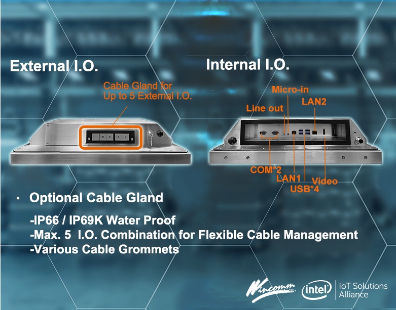 Fig 3. Optional cable gland for external I.O. solution, 2 x USB 2.0, 2 x USB 3.2 Gen2, 2 x USB 3.2 Gen2 (Type-C, Support DP1.4a display output, Power output 5V/3A), 2 x HDMI 2.0b, suits for the rapid changed industrial environments with various I.O. combination under IP66/IP69K test proof.