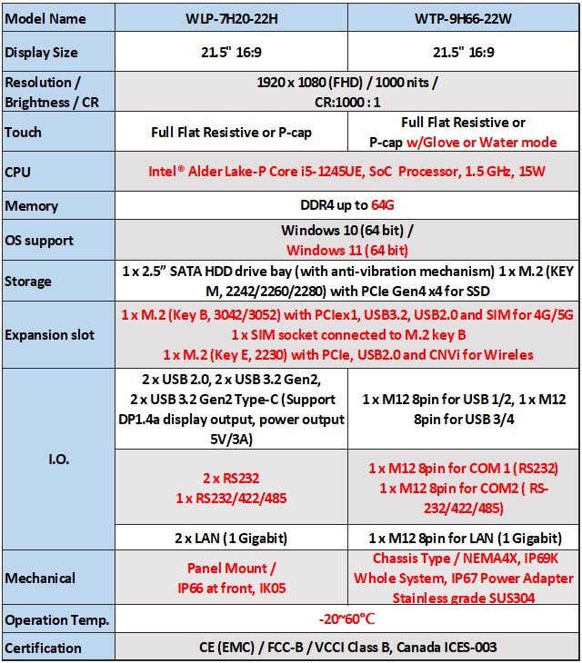 In addition, this WLP-7H20 series provides expansion slot with 1 x M.2 (Key B, 3042/3052) with PCIex1, USB3.2, USB2.0; 1 x SIM socket connected to M.2 key B, and 1 x M.2 (Key E, 2230) for wireless. Besides, its exterior housing can be customized to suit for versatile applications. This series offers a 22-inch display with 1000 nits of brightness, and an optional sunlight-readable solution , providing developers with versatile choices.
