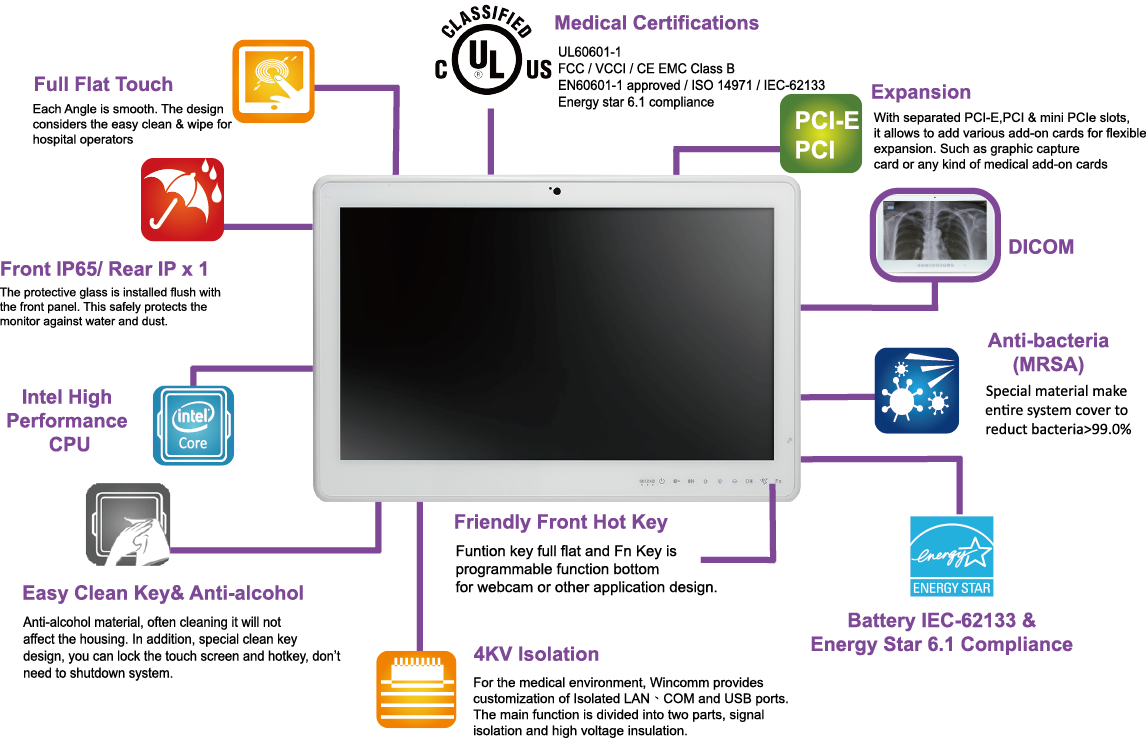 One significant challenge that must be overcome to realize smart hospital and IoMT deployments based on dynamic EMRs is medical imaging. Medical imaging is the largest and fastest-growing data source in the healthcare industry, accounting for 90 percent of all healthcare data. To fulfill this trend, Wincomm innovates together with our partners to develop medical Panel PC, WMP-G/H series designed from the ground up for deployment in smart hospital environments.The scalable TFT LCD multi-touch displays range in size from 22” to 24”, and offer resolutions of up to 1920 by 1080 full-HD to 4K2K UHD resolution.They even provide optional support for the Digital Imaging and Communications in Medicine (DICOM) standard, which delivers high levels of luminance for clinical-grade examination in operating rooms or at a patient’s bedside.