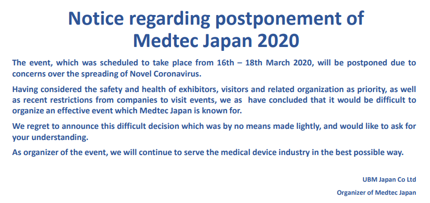 Due to the following reasons, to secure all participants health, it is announced postponement notice by the organizer of Medtec, JP, therefore, we appreciate your understanding of this difficult situation. As what we have promised, all our staffs would continuously provide our best service to serve all related industries and sincerely wish there is a peaceful and safe future. If there is any question, please feel free to contact us at sales_support@wincomm.com.tw