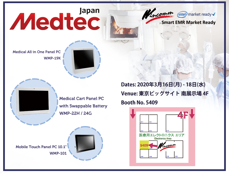 Welcome to visit Wincomm booth, No. 5409, Tokyo Big Sight, Tokyo, Japan from March 16th to 18th, 2020. During this exhibition, it is announced brand-new medical grade touch panel PC solutions, from entry level, Apollo Lake 10.1” WMP-101, medical Cart series, hot swappable batteries Kaby Lake 24” WMP-24G, to AI enhanced series, w/MXM Graphic Card Coffee Lake 19” WMP-19K. For more details, please contact us at sales_support@wincomm.com.tw and see you soon.