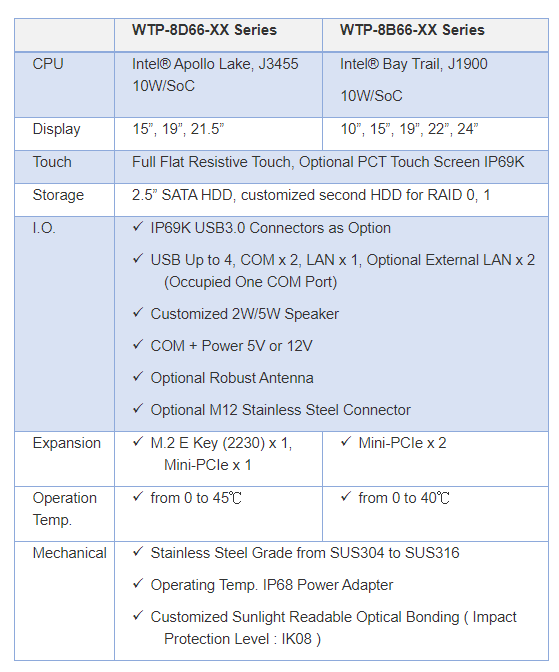 With the Industrial Internet of Things (IIoT) being incorporated into almost anything, manufactures pay more focus on how to make factory device more flexible, durable, and easier to use. And looking for devices that are rugged and minimize the maintenance costs is always what managers concern. WTP-8D66 series equipped with Intel® Celeron® J3455 CPU (codename: Apollo Lake, Passmark:2114) and up to 8GB of DDR3L RAM, targeting on optimizing utilization on quad-core processing, size ranging from 15”~21.5”. With powerful thermal design to support higher computing power and high data transmission rate I.O. port, WTP-8D66 series could even provide wider operation temperature from 0 ℃ to 45 ℃ . Fulfill the entry growing demand in rugged environment with hygienic considerations including pharmaceutical, food, beverage, chemical industries.
