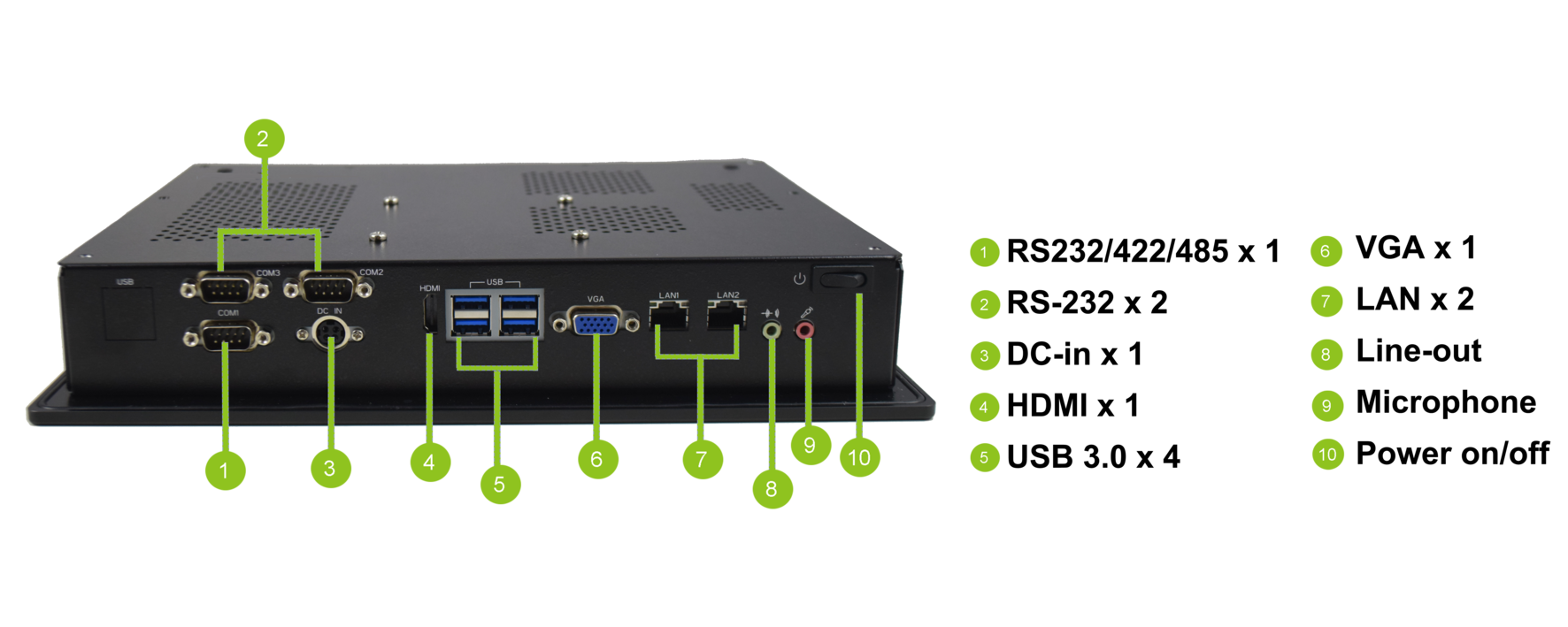 Fig 1. Continued with WLP-7B20 series housing design, WLP-7E20 series owns HDMI, USB 3.0 x4, COM x3, and optional USB 2.0. More I.O. selections and expansions makes it useful for applications.