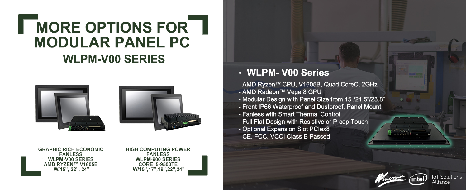 Wincomm introduces one more modular touch panel PC series, WLPM-V00 series , which is capable with graphic heavy loading applications. Featuring at AMD Ryzen™ embedded V1605B (PassMark: 6812), 25W, 4-core/ 8-thread processor, it delivers up to 3x times the CPU performance over previous WLP-7F-xx series. From GPU performance point of view, it comes out an unheard of 3.6 TFLOPS in FP16 for an ultra-compact box PC controller. Moreover, it continuously keeps water and dust proof IP66 front and fanless thermal solution as WLP series design, so WLPM-V00 series successfully enhances its imaging performance compare to the previous WLP-7F series, and makes it ideal to cost saving with high imaging loading applications to suit for rugged fanless operation conditions.