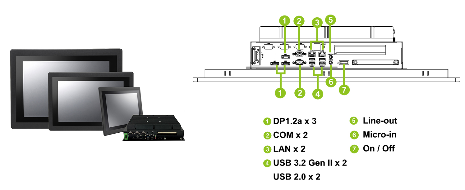 The WLPM-V00 series come up with the docking structure, smart thermal management, water and dust proof IP66 front panel mount, wide operation temp., from 0℃ to 50℃. It builds with rich I.O., including USB3.2 Gen II up to 2, optional USB2.0 up to 2, COM x 2 and LAN x 2. Offered optional add-on parts, such as PCIex8 riser card and customized open frame or chassis type. Besides, all WLPM series provide accessible 2.5”HDD/SSD bay w/side door for easy replacing the storage without opening the back cover, and unique cable relief built in to unit, to remove the stress on the cables from the IO.