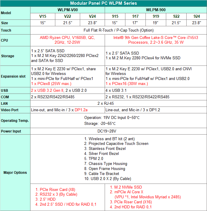 Extended the WLPM-900 modular panel PC series mechanical design, this WLPM-V00 series is composed of a box PC platform with scalable panels, ranging from 15”, 21.5” to 23.8”. Leveraging AMD Ryzen™ Embedded V1605B 4-core/ 8-thread with GPU benefits, WLPM-V00 series could fully satisfy users with graphic rich but economic applications and provide cost saving choice compared to high computing power WLPM-900 Core i5-9500TE series.