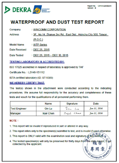 在品質保證上,Wincomm Full IP66/69K/67 不鏽鋼系列中,每一台在全機防水測試上,皆經過Wincomm特有的檢驗方式,透過嚴格的測試保證,才能確保WTP系列機種都可100% 達到IP66/69K/67等級的防水防塵。