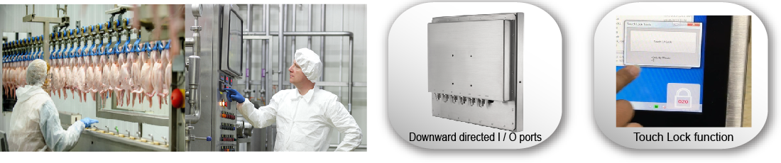 針對食品加工產業與工業4.0的嚴苛環境,WTP-9E66 Series延續之前WTP-9A66與WTP-9C66的亮點設計,將I/O接頭方向朝下,符合食品加工應用環境的需求,使得工廠佈線更方便。高強度鋅合金M12 I/O金屬接頭與adapter具有IP67等級,堅固耐用又防水。SUS304不鏽鋼機殼,可確保電腦在食品級無汙染的環境中,承受高壓水柱與酸鹼溶劑的腐蝕。全平面無縫設計與密封式背蓋設計,可避免細菌在縫隙中生長。此外,在直覺式操控上,Wincomm提供電阻式觸控與電容式觸控兩種選擇,但考量到食品工廠的清潔需求,Wincomm獨家設計Touch Lock 軟體介面,讓食品加工生產線在清潔時,不需要關機也不會有誤動作的現象產生。