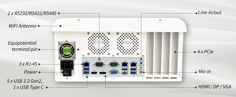 The WPC-789-PSI supports up to three displays via HDMI, DisplayPort, and VGA. Extensive connectivity includes two USB 3.2 Gen1 ports, five USB 3.2 Gen2 ports, one USB 3.2 Gen2 Type-C port, two COM ports, and three RJ-45 network ports supporting 2.5Gb Ethernet. Integrated Intel® AMT/VPro technology facilitates efficient remote management.