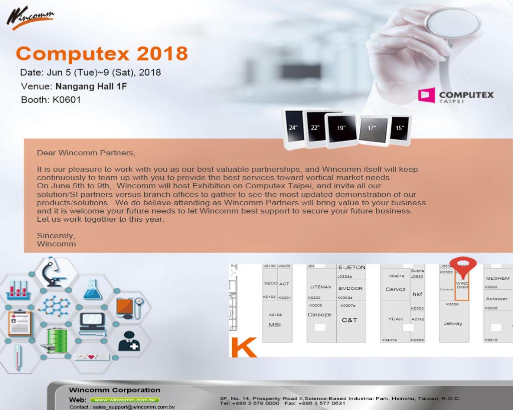 Wincomm Corp. welcomes your visit to Wincomm at Booth No. K0601 during the Computex Taipei, TW, on June 5, 2018 at the Nangang Hall 1F, Taipei.