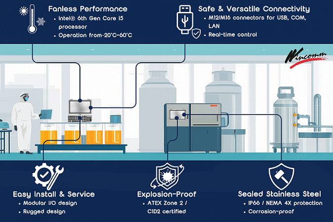 These ATEX Zone 2 / C1D2-certified panel PCs provide full ingress protection (IP66/NEMA 4X), making them fully sealed against dust, water, and corrosive vapor—crucial in solvent‑exposed zones.