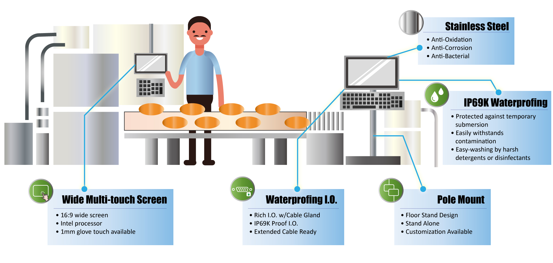 Designed for versatility, the WTP series supports floor stands, ceiling mount, customized integrated housing and wash-downward I.O. to support machine control. All I/O outputs are IP66 certified, ensuring reliable performance even in the harshest conditions.