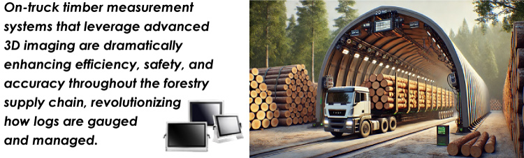 Accurate, efficient measurement of timber is vital for maintaining fair transactions, optimizing inventories, and supporting smooth operations across the forestry supply chain. Yet, traditional manual methods commonly cause delays, pose safety hazards, and fuel disputes over accuracy. To counter these issues, a specialized drive-through imaging system employs multiple camera-laser pairs and high-resolution cameras inside a 20-meter-long tent. This setup enables fast, reliable, and traceable log-truck measurements—completed in under 90 seconds.