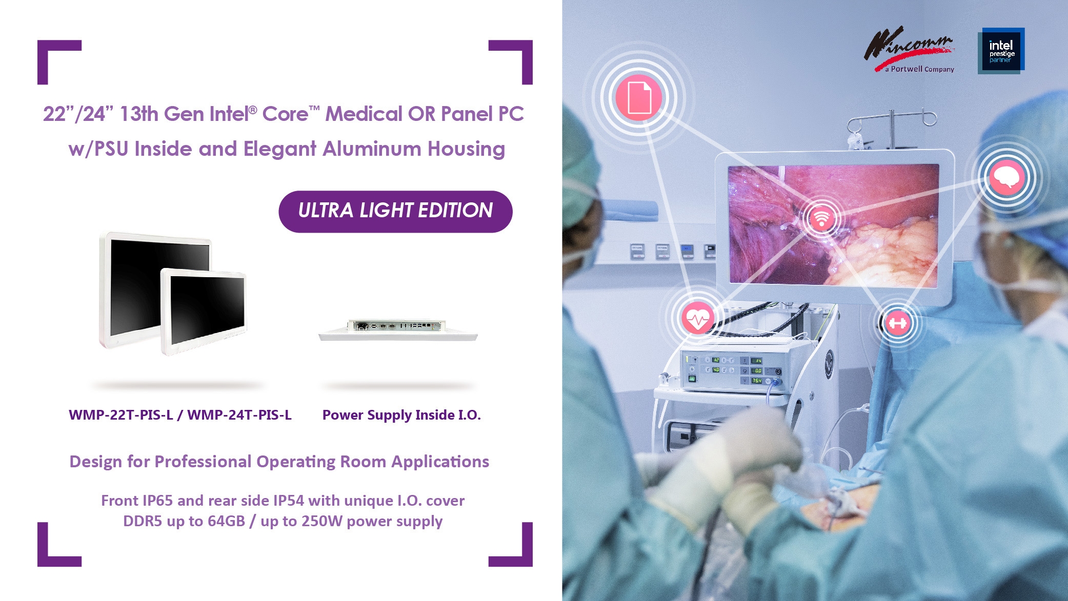 HSINCHU, TAIWAN — February 10, 2026 —– Wincomm, a global leader in medical computing, is proud to announce the release of the WMP-22T-PIS-L and WMP-24T-PIS-L, a revolutionary 21.5-inch and 23.8” medical All-in-One PC. Engineered specifically for Operating Rooms (OR) and high-stakes clinical environments, the WMP-22T/24T-PIS-L series redefines portability and efficiency by combining a high-performance fanless design with a built-in power supply—all in a chassis weighing just 7.8 and 8.6 kg.