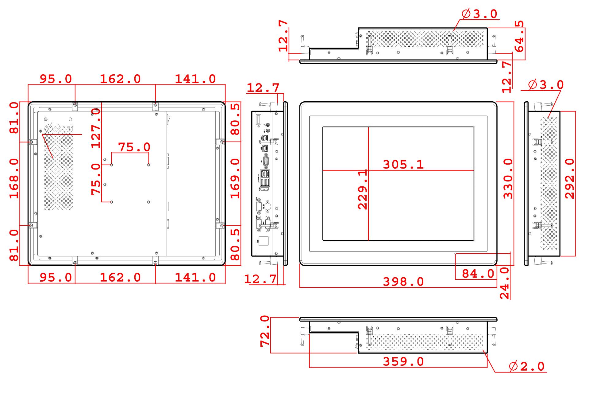 Dimensions (Net) 398 (H) x 330 (V) x 72 (T)