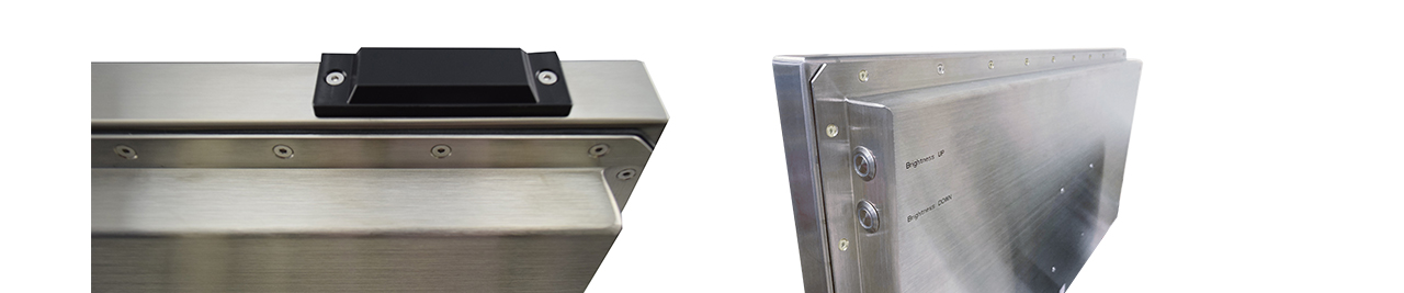 圖2. 整合內嵌式天線技術 (左),及增設亮度調整按鈕 (右)。此兩項技術皆達100% 防水及防塵等級,全密閉抗氧化不銹鋼機身設計,外部增設可調式亮度按鈕,便於客戶在各種嚴苛工廠環境下等情境應用。