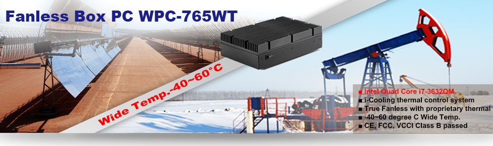針對嚴酷的環境挑戰,Panel PC的領導品牌Wincomm推出寬溫強固型Box PC WPC-765WT,WPC-765WT的特色在於搭載Intel 高效能四核心CPU Core i7-3632QM,無風扇設計外還可以在溫差大的環境下運轉自如。Wincomm強大的散熱設計,有效排除CPU運轉所產生的熱能,使四核心CPU能將效能發揮到極致,Benchmark達到7018,這都要歸功於散熱片上的熱導管設計,散熱極佳,係數高達7000 W/mk。此外,除了機構上的硬體散熱設計外,主機板上透過BIOS設計,可以控制CPU升降頻,達到溫度的有效控制,稱之智慧型自動化散熱控制系統。