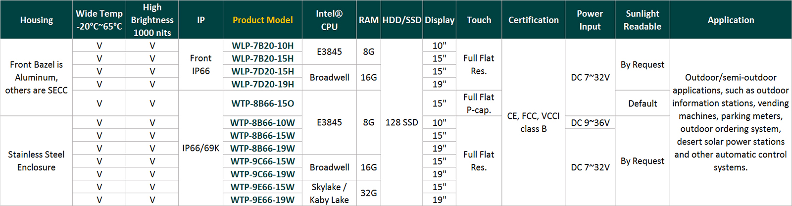 專為室外應用而設計,例如室外訊息站、自動販售亭、停車場收費亭,室外自動服務系統、沙漠太陽能發電站和其他自動化設備。配備全密封機構,防水設計讓用戶可以輕易的安裝在任何裝置內,並能節省成本。 IP66 / IP69K防水防塵標準意味能承受高壓噴水和灰塵擴散,而能夠通過IP67等級認證,也代表中美萬泰團隊提供的產品能夠承受浸入1米深的水中長達30分鐘。在質量保證方面,中美萬泰的IP66 / IP69K / IP67不銹鋼電腦系列,每台機器都經過嚴格的測試程序,以確保防水和防塵達到IP66 / IP69K / IP67認證等級。