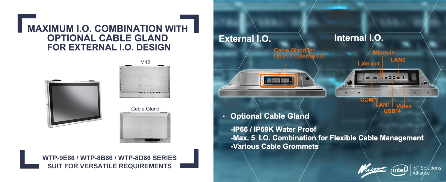 一般來說,多數工業級觸控電腦機構外圍都裝配有密封電纜接孔,保持密封性同時更為電腦設備提供乾淨、安全的連接口。 在需要全密閉的應用中,中美萬泰設計IP66/IP69K等級系列電腦,該系列配有不銹鋼外殼和固定I.O.設計的M12金屬電纜接頭,可透過客製化M12金屬接頭的組合來擴充外部I.O.的應用。 而隨著客製化需求的增長,中美萬泰創新的電纜彈性密封接頭,不僅能縮短不同I.O.組合設計完成時間,亦可滿足各樣應用下的客製需求,使其成為高效且經濟的防水接頭解決方案。
