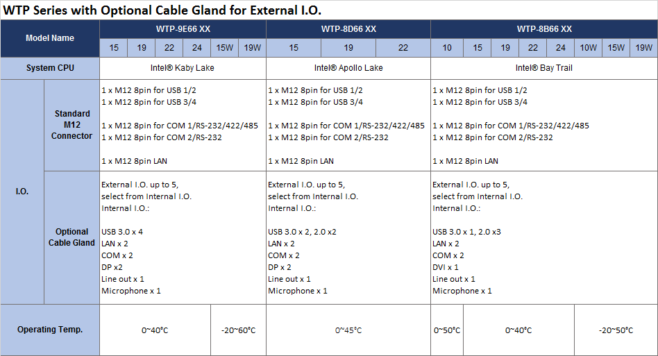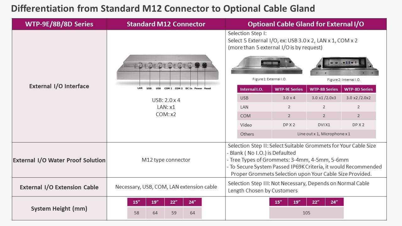 圖 2. 上表“從標準化M12接頭到可選配的電纜彈性密封接頭的區別”,說明了與標準相比的差異化以及如何依序選購,其涵蓋了WTP-9E66,WTP-8B66和WTP-8D66等防水防塵不鏽鋼電腦系列。