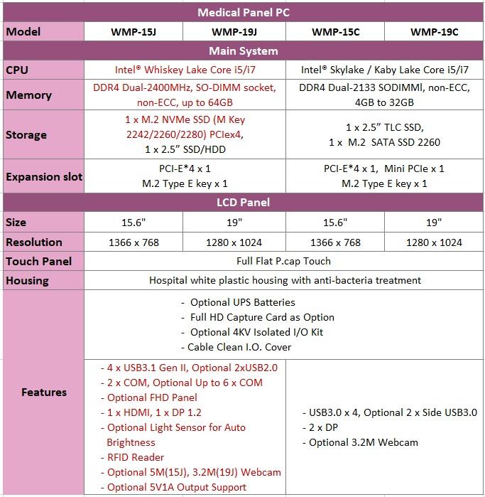 中美萬泰發布全新醫療級行動觸控電腦 WMP-15J 和 WMP-19J 系列,延續既有暢銷機種WMP-15C/19C系列,內建不斷電電池設計,全機防水IPX1,前框IP65可防各式潑水外,全系列升級英特爾第八級U系列行動高效運算處理器,針對醫療級病人照護在醫院的各項運用提供最佳化設計。雙硬碟設計,升級M.2 NVMe SSD加速開機時間外,第二顆硬碟可選配2.5” HDD或SSD,也升級無線網卡(Wifi及藍芽)介面為M.2 E,保留獨家可擴充PCIx4外插卡設計,並通過最新歐盟美國等國級醫療級認證,使其設計不僅便利醫院行動醫療布建,也適用於看診、照護、診斷等醫療需求。