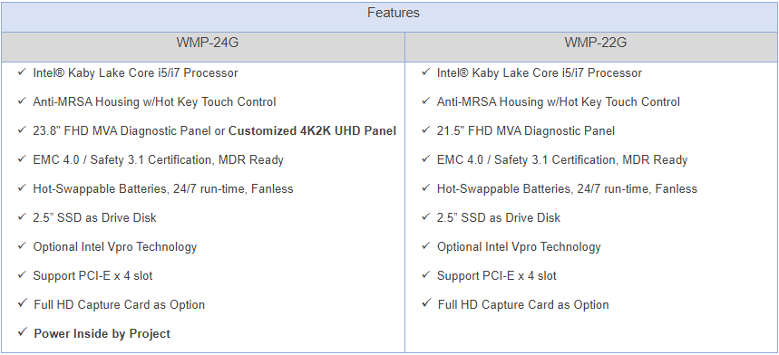 WMP-22G/24G 系列搭載不同介面設計,如LAN x 2, COM x 2, USB 3.0 x 4, DP x 2, 以及 PCI-E 擴充介面 x 1,適用於醫療環境中不同應用場景的需求,其中可擴充PCI-E介面設計,能支援各式不同PCI-E介面應用,如影像擷取卡等常用功能。此系列採用 2.5吋 固態硬碟開機,優化開機效率,並透由英特爾第七代處理器(Kaby Lake) 達3.5GHz轉速,高效能配備能因應重度醫療影像運算傳輸需求外,更能因應智慧醫院互聯網需求做不同擴充搭配,打造行動醫療的最佳平台。