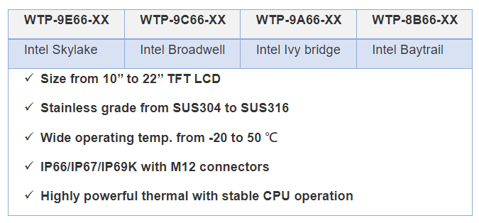 中美萬泰的不鏽鋼觸控電腦WTP系列產品分為四大項,分別為WTP-9E66-XX(Intel Skylake ePlatform)、 WTP-9C66-XX (Intel Broadwell ePlatform)、WTP-9A66-XX (Intel 3rd gen. ePlatform) 以及WTP-8B66-XX (Intel Baytrail ePlatform)。最新上市提供的WTP-8B66-10W機種,提供 10吋的寬溫選擇,為目前業界同級品中寬溫最小尺寸,您可依需求,找尋到最適解決方案。