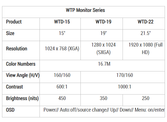 【2018/11/12 新竹】醫療級電腦領域的領導供應者,Wincomm推出工業顯示器產品系列,提供寬溫設計及日照下閱讀的解決方案,更加符合食品/飲料、化學、製藥、自動化工廠等各樣環境應用,產品系列WTD series規格從15吋 、19吋到21.5吋。