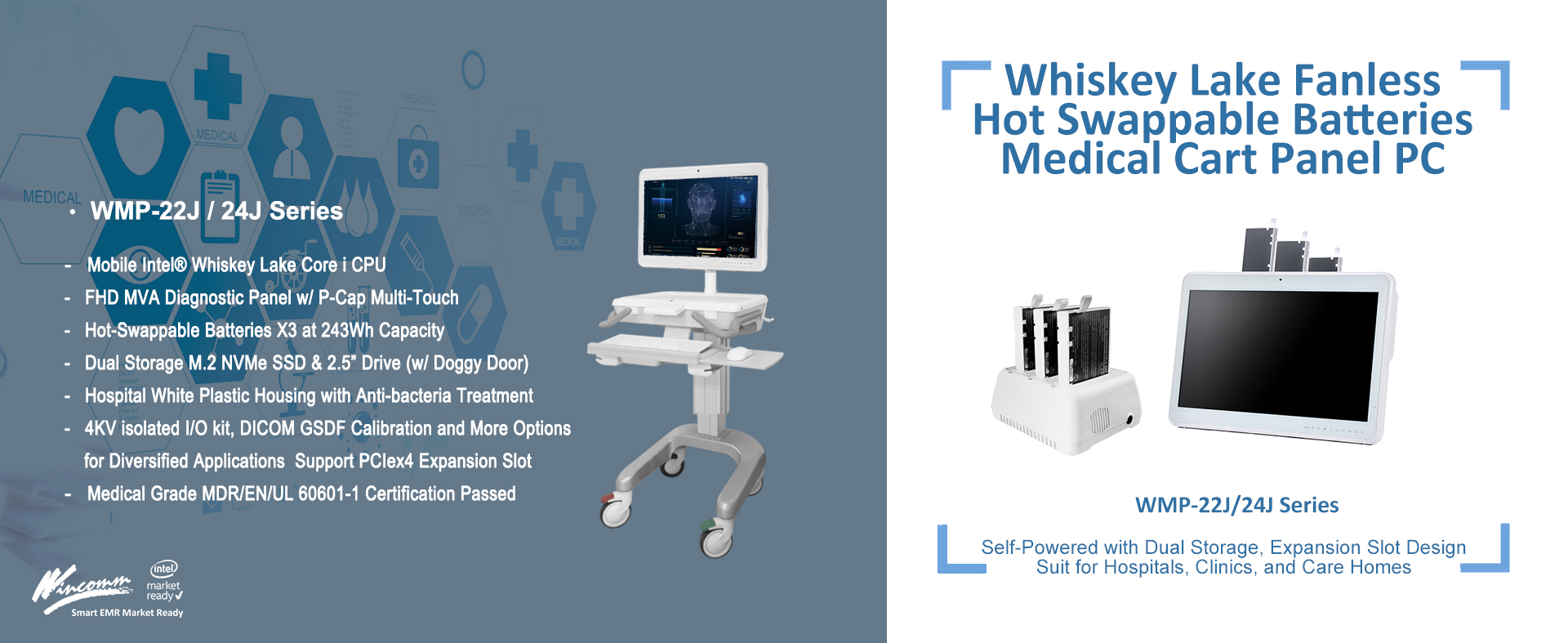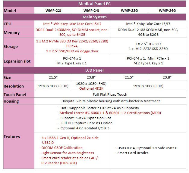 中美萬泰發布全新醫療級行動觸控電腦 WMP-22J 和 WMP-24J 系列,延伸榮獲設計大獎的 WMP-22J/24J 系列既有內建達三顆可熱插拔電池獨特設計,全機防水IPX1,前框IP65外,全系列升級英特爾第八代U/UE系列行動高效運算處理器,針對醫療級護理推車在醫院的各項運用提供最佳化設計。雙硬碟設計,升級NVMe SSD加速開機時間外,第二顆硬碟可選配2.5” HDD或SSD,透獨特側開滑動開口設計便利安裝,也升級無線網卡(Wifi及藍芽)介面為M.2 E,保留獨家可擴充PCIx4外插卡設計,並通過最新歐盟美國等國級醫療級認證,使其設計不僅便利醫院行動醫療布建,也適用於看診、照護、診斷等醫療需求。