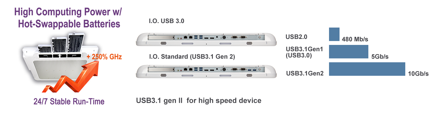 最佳化資料輸入輸出傳輸效率,此系列也全面升級為USB 3.1 Gen II標準介面四個,可選配側開USB2.0兩個(採用不同背蓋設計),COM標準介面兩個,超高速乙太網路(GbE LAN)標準介面兩個。不僅如此,提供選配可絕緣介面,保護銜接醫療設備,免於被回朔電路燒毀風險。針對醫療常需延伸螢幕,讓醫療專業人員判斷的需求,提供至少2個延伸螢幕介面( Display Port),一個獨到的影像輸入HDMI (Video-In)介面, 可輸入(麥克風)輸出(喇叭)孔各一, 選配TPM 2.0提供絕佳平台安全性保障,及可選購的輸出線路外接孔蓋(IO Cover),能將外露線孔遮蔽美化機台整體。