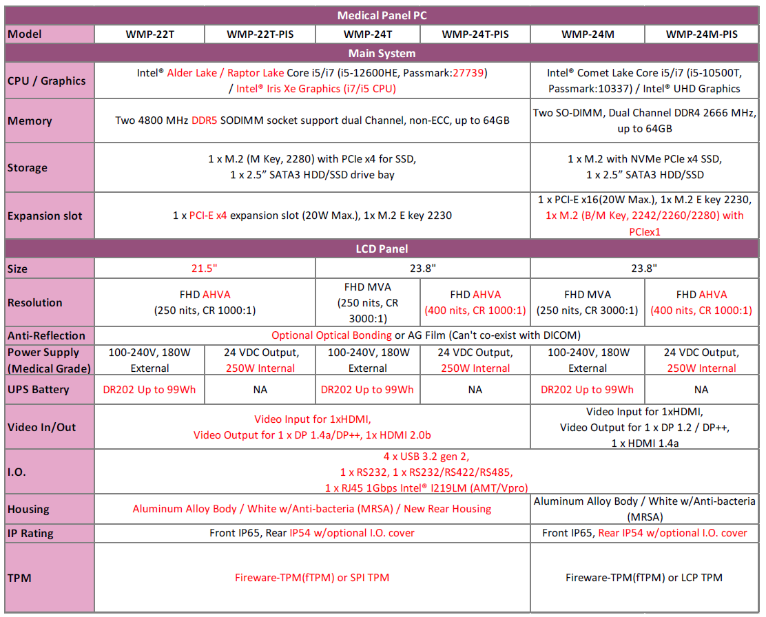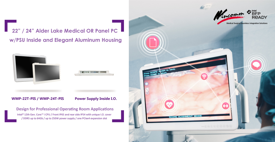 Wincomm 推出了 WMP-22T(-PIS)/24T(-PIS) 系列 ,專為醫院手術室應用而設計。配備 Intel® 第 12 代 Core™ i7/i5/i3/Celeron 處理器,功耗 35W,無風扇,前部 IP65,後部 IP54,帶有獨特的 I.O. 蓋板,創新的雙視頻輸入/輸出端口設計,最高 250W 電源供應和一個 PCIex4 擴展槽,以支持手術過程中的醫學影像處理。WMP-22/24T(-PIS) 系列提供了兩種尺寸,21.5” 和 23.8”,並通過了醫學最新認證 (UL/cUL Safety V3.2),適用於大多數醫院手術室應用。此外,由 WMP-24M-PIS系列 延伸,這一系列也支持 21.5” 和 23.8” 這兩種尺寸的內置電源供應,專為手術室的安全和良好的人體工學設計而設計。