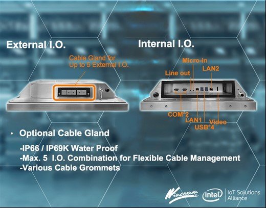 中美萬泰設計IP66/IP69K等級系列電腦,該系列配有不銹鋼外殼和固定I.O.設計的M12金屬電纜接頭,可透過客製化M12金屬接頭的組合來擴充外部I.O.的應用。面對瞬息萬變的工業應用環境需求,現在更創新推出用於外部I.O.電纜彈性密封接頭設計,不僅縮短客製化時間更能夠降低成本費用,並可直接適用在大部分的工業應用設備。 導入這種新的選配設計,能極大化彈性I.O.的應用組合,對外達5個I.O選購組合,適用於各式不同工業環境下應用需求。