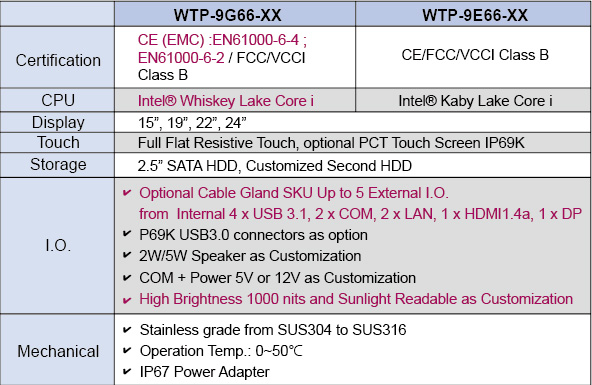 中美萬泰正式發布防水防塵IP69K不銹鋼觸控電腦WTP-9G66系列升級更大運算力英特爾Whiskey Lake Core系列處理器,螢幕尺寸涵蓋15吋、19吋、21.5吋至23.8吋,適合各式食品製藥及化學醫護等特殊環境應用。順應工業4.0趨勢,全系列搭載選配USB 3.0傳輸線材及備份硬碟方案,快速資料存取,強大散熱設計支持,達全機標配IP69K最高防水防塵規格,滿足客戶在各式高度衛生安全環境需求下的嚴苛應用。