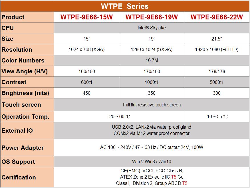 針對於潛在的危險區域的多種應用,中美萬泰WTPE系列提供靈活、堅固的接頭USB(max ports x4)和LAN(max ports x2)設計,以及等級達IP66防塵防水M12 COM接頭,除此之外,我們更有針對用戶無線天線需求而設計的強固天線,天線防塵蓋更兼具強固且易清潔的特性。我們將所有接頭設計向下,更加便於使用者安裝和節省空間。 WTPE系列還配備智能熱系統,可在-20℃至60℃的寬溫度範圍內運作正常,可適配於多種環境。WTPE系列整體具防腐蝕和100%防水保證,絕對適用於與氣體和蒸氣物質相關的最惡劣的工業環境。