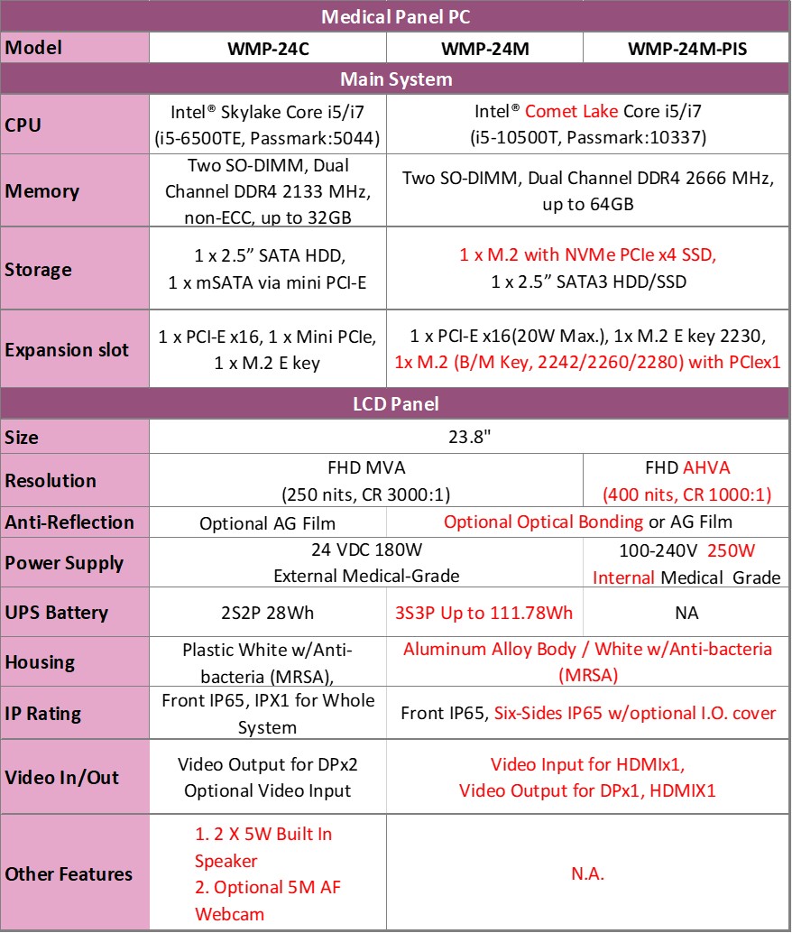 此系列搭在英特爾第十代處理器35W,其中可選用Core i7-10700TE達八核心,最高達4GHz運算時脈處理器,或Core i5-10500TE, 達六核心,最高達3.7GHz運算時脈處理器 ;配備雙通道 DDR4達64Gb及超高解析度影像顯卡 630, WMP-24M(-PIS) 系列在影像處理及數據處理表現有顯著優化。同時透過雙硬碟,其中主要硬碟為高效M.2 NVMe PCIex4 SSD,提升開機速率的設計,第二可擴充硬碟為 2.5” SSD/HDD slot可供備份硬碟擴充使用。透過中美萬泰研發團隊獨創設計,不僅達無風扇設計,並提供智能控制軟體(i-control),最佳化散熱,電腦運算及電源管理,確保手術房內使用時,要兼顧高運算效能、同時散熱跟電源管理達安全使用等級,能讓運行重要生理監測信號或圖像安全進行,從而確保麻醉師、醫生及醫療人員能專注在手術操作。預留PCIex16擴充介面,通常提供手術室需用影像擷取卡使用,以獨創智能控制軟體最佳化操作性能,滿足更便捷即時性影像傳輸及安全使用。