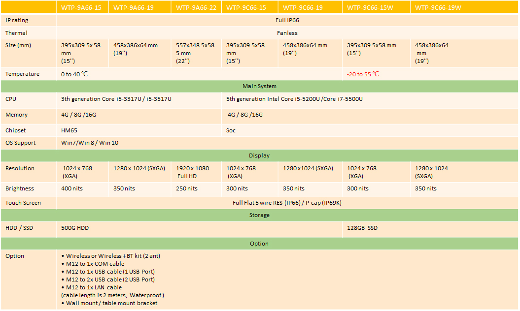 而寬溫系列更著重於溫度的處理範圍,才能達到在-20 to 55℃的環境維持24/7/365穩定運作。WTP-9C66-15/19 W在零組件選擇上使用寬溫的SSD 128GB與寬溫Memory DDR3L 1333/1600 MHz, 這些關鍵零組件都是經過嚴格挑選,符合寬溫設計的規格,不是一般業界用的Sorting方式。