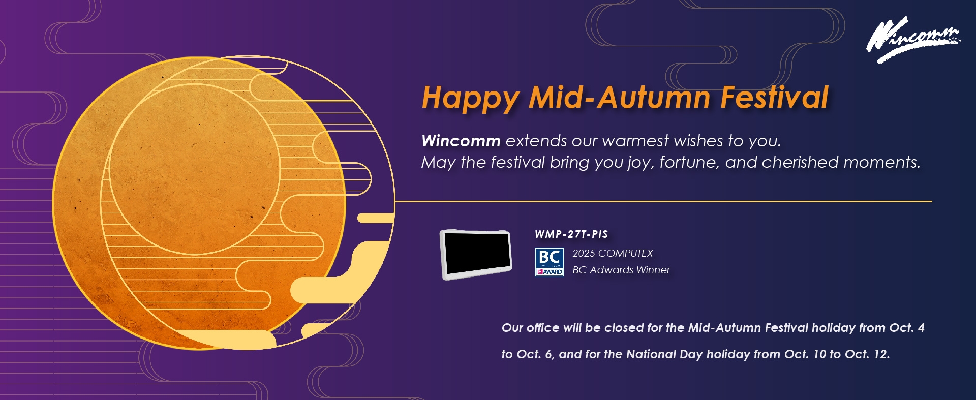 Wincomm 向您致上最誠摯的問候,感謝您長期以來的支持與信任。值此中秋佳節,謹祝您節日愉快、闔家平安、幸福安康!本公司將於中秋節連假 10/4-10/6 及國慶連假 10/10-10/12 暫停營業,