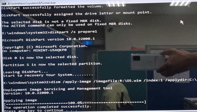 - 當畫面顯示 「The operation completed successfully」(操作已成功完成)時,表示 OS 還原程序已完成。系統將在程序結束後自動重新啟動。