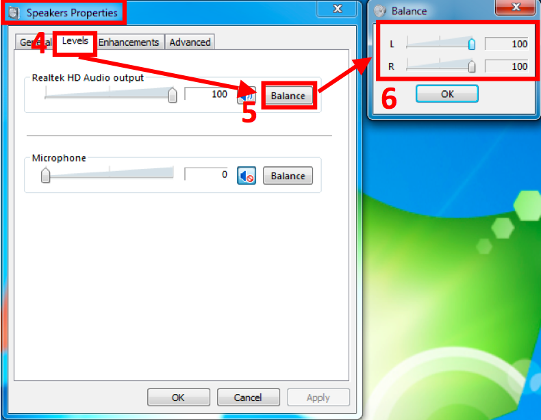 - 在「Realtek HD 音效輸出」的「平衡」項目中,左右聲道 (L & R) 皆為 100。
