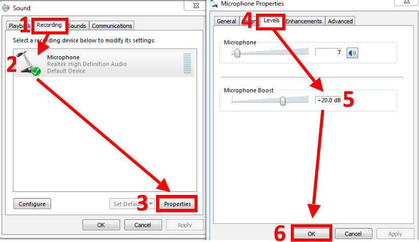 - 在「等級」分頁中的「麥克風增益」為 +20dB。