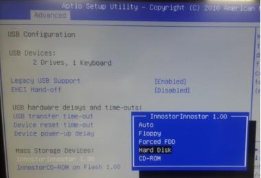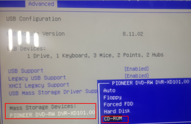 Select Advanced > USB configuration > Change CD-ROM setting from AUTO to CD-ROM