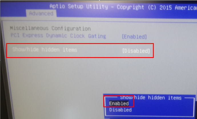 3. Select Advanced > Miscellaneous Config… > Show/Hide hidden items > Enable